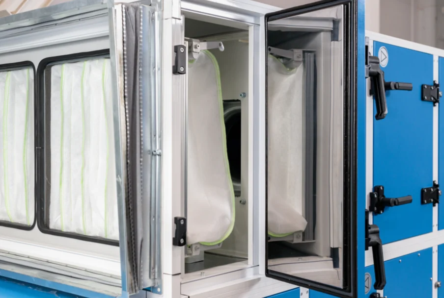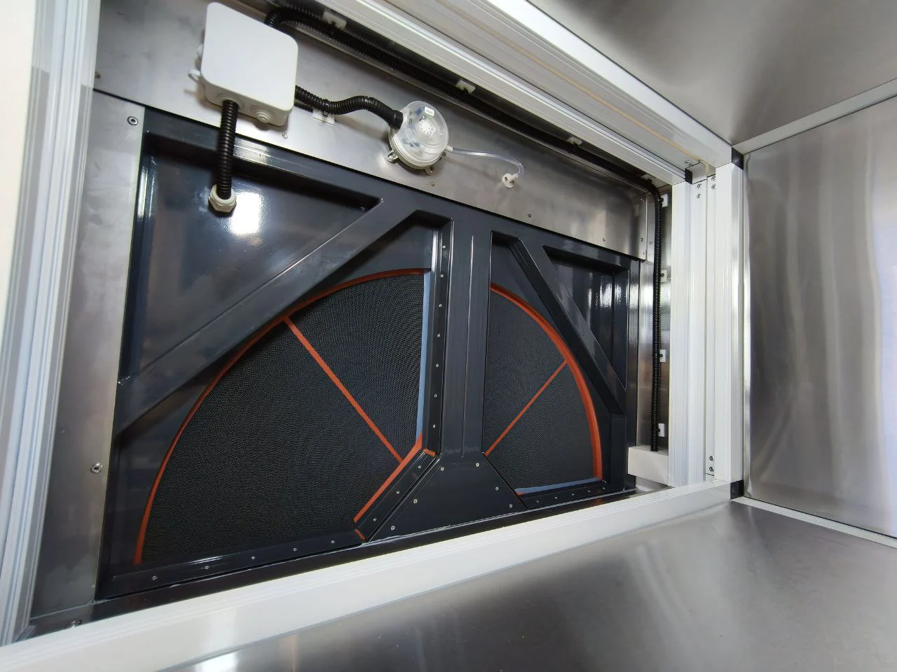 Корпус премиального типа изготовлен из звуко- и теплоизолирующих панелей, c применением теплоизолированного профиля. Профиль покрыт порошковой краской. В конструкции профиля присутствует терморазрыв, предотвращающий образование мостиков холода. Панели с двойными стальными стенками толщиной 0,7 мм, между которыми находится изоляция из минеральной ваты по периметру панели нанесен специальный полимерный герметизирующий слой типа «Gasket». Толщина панелей 42/54 мм. Такой каркас установки позволяет снизить шумы и добиться абсолютной герметичности.